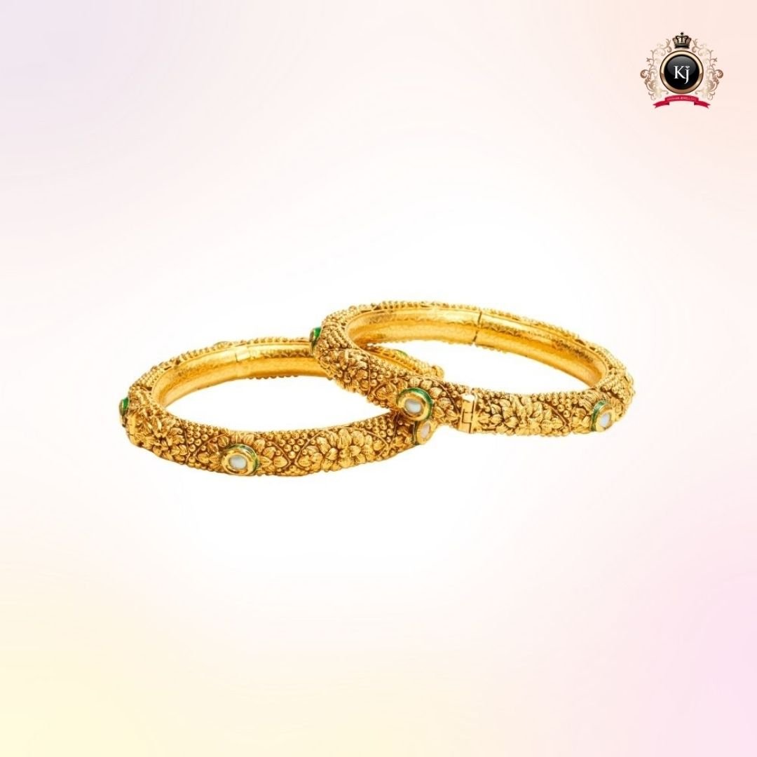 Intricate floral embossing and the antique finish reflect centuries-old artistry, while the kundan-set green and white stones radiate prosperity, purity, and prestige. The Rajdarbar Kada isn’t just jewellery — it’s a symbol of nobility and legacy, designed for those who carry the essence of royalty within.