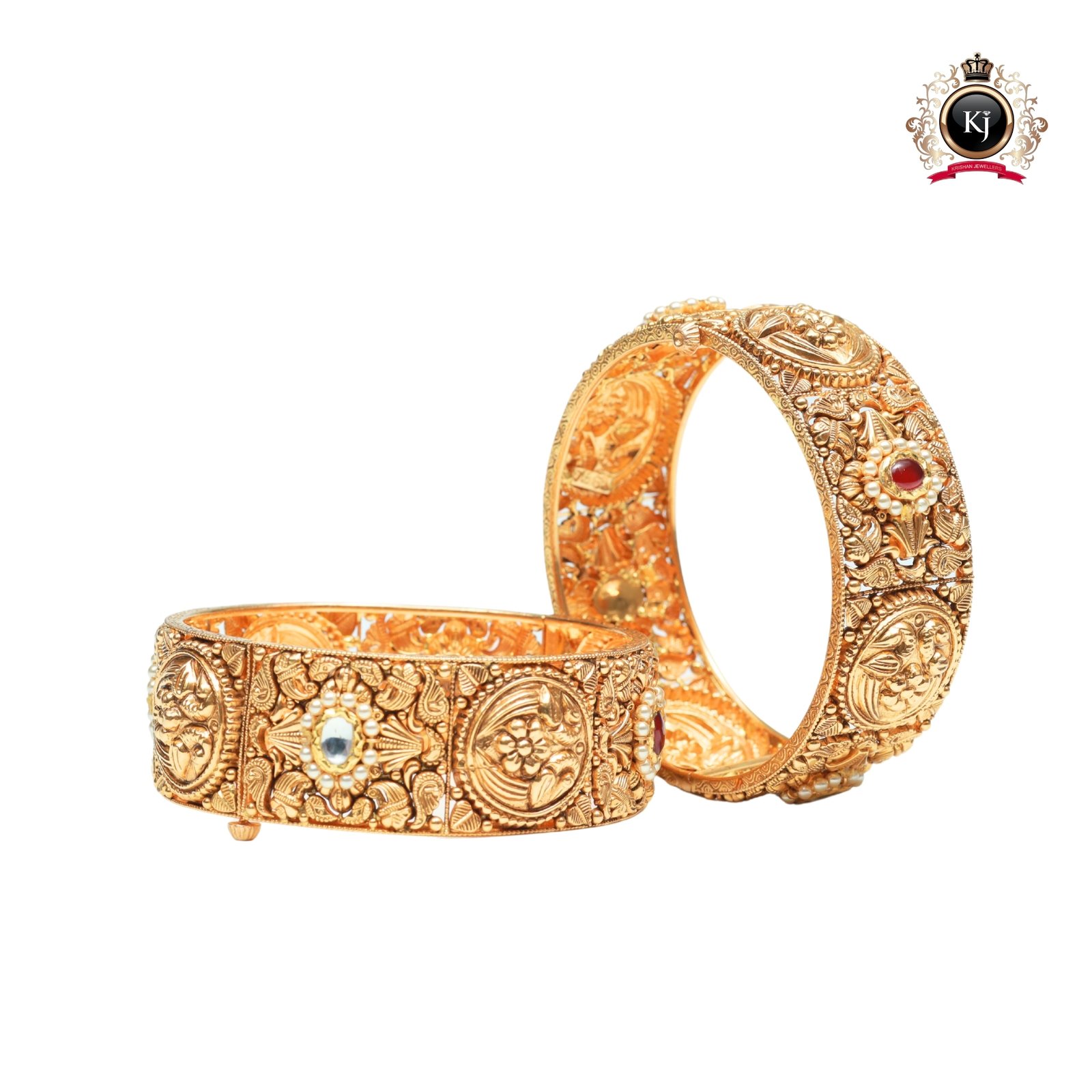 This bold 22K gold kada pair reflects the grandeur of royal palaces and the enduring strength of tradition. With its intricate motifs and elegant craftsmanship, Rajsi Kada stands as a symbol of power, prestige, and grace — crafted for those who wear their legacy with pride.