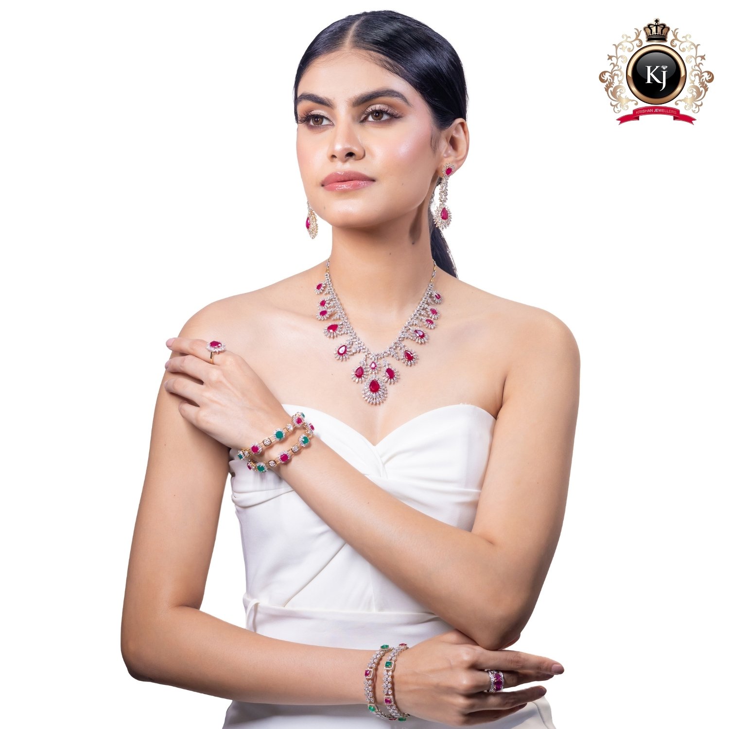 Design: Grand necklace with teardrop rubies framed in diamond clusters, paired with long chandelier earrings